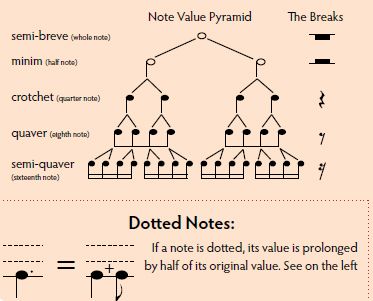 On the left side you can spot the note value pyramid. It describes how to understand semi-breve, minim, crotchet, quaver or semi-quavers... In English much more complex in words as in German.